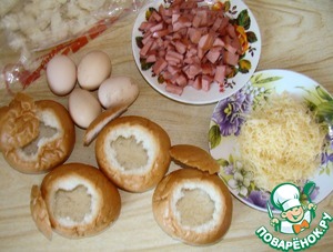 Подготавливаем наши ингредиенты. У булочек срезаем "крышечку", вынимаем мякиш, оставляя стенки около 1 см. Сосиски или любые колбасные изделия режем произвольными кусочками и обжариваем (не обязательно). Сыр натираем на мелкой терке.