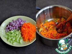 Овощи помыть, обсушить, нарезать лук мелкими кубиками, морковь натереть, сельдерей нарезать. Слегка обжарить на оливковом масле.