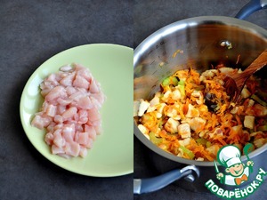 Куриное филе помыть, обсушить, зачистить от пленок. Нарезать мелкими кубиками, добавить к овощам.