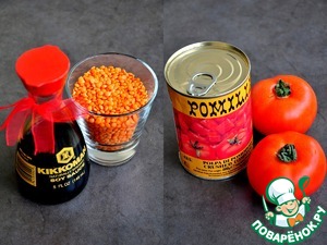 Как только филе побелеет, добавить рубленые томаты в собственном соку (или очищенные от кожицы свежие). Хорошо перемешать, влить воду. Варить на медленном огне минут 10. Влить соевый соус, добавить чечевицу.