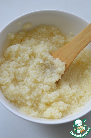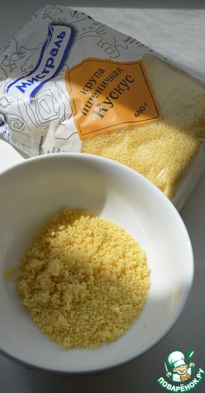 В кастрюлю засыпьте 150 г кускуса и залейте горячей водой, накройте крышкой и дайте настояться.