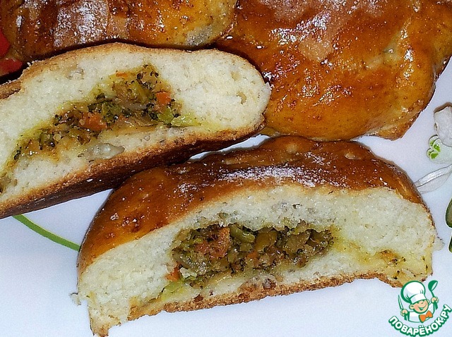 Тесто на газировке. Начинку делала с цветной капустой и брокколи. Моя любимая капустка!!! Часто применяю её во многих рецептах. Очень нравится чуть подсоленная и немного отваренная...
