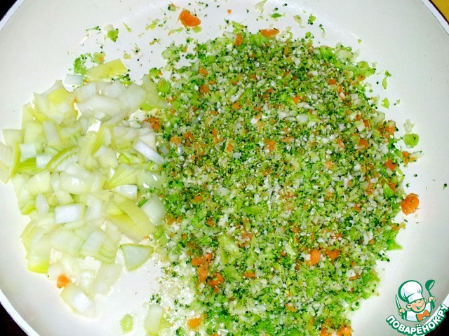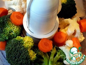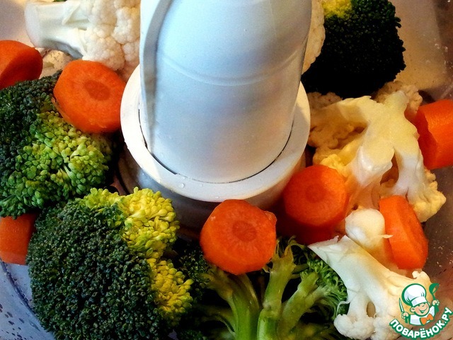 Пока тесто стояло в тёплом месте, поднималось, приготовить начинку из брокколи и цветной капусты. Измельчить её соцветия и морковь в миксере. Лук порезать.