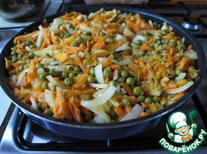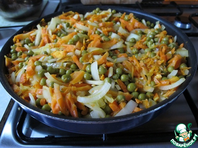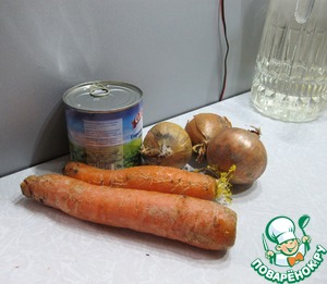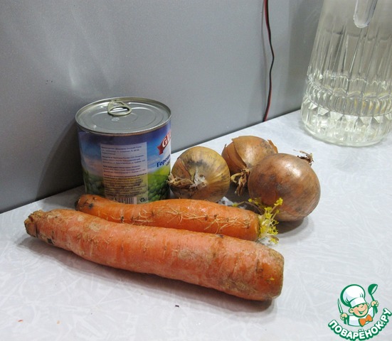 Я целенаправленно не написала количество продуктов - оно может быть любым. Главное - соблюсти пропорции: продуктов должно быть примерно одинаково по объему. Ну вот как на этой фотографии: на две большие морковки примерно три не очень больших луковицы и банка зеленого горошка.