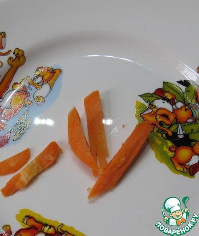 Ну или если в вашем кухонном комбайне есть терка, на которой можно потереть вот такими кусочками. (Это важно - морковь, натертая на такой терке останется хрустящей в процессе приготовления, в этом и есть одно из достоинств этого рецепта.) А порезать морковку так руками вряд ли получится.