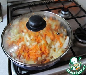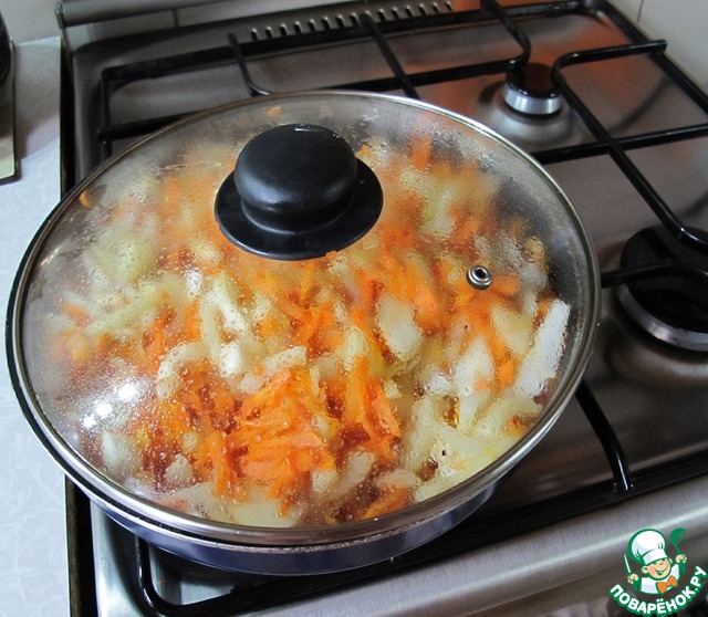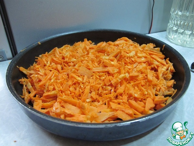 Ставим сковородку с натертой морковкой на плиту, поливаем подсолнечным маслом, перемешиваем и даем ей чуть-чуть "припуститься", буквально пару минут на несильном огне. Далее засыпаем к морковке нарезанный лук, солим, перемешиваем, накрываем крышкой и тушим под крышкой на опять таки не сильном огне до тех пор, пока лук не потеряет свою горечь (не перетушите - лук должен остаться хрустящим). Естественно пару раз нужно будет открыть крышку и перемешать, чтоб тушилось равномерно.