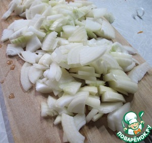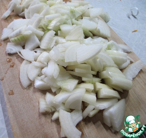 Чистим и нарезаем лук ( порезав луковицы на четвертинки). Кстати, чтобы не щипало глаза в процессе нарезки лука, нужно подержать нож под ледяной водой и намочить доску. Если потом нарезать лук достаточно быстро, то глаза не щиплет.