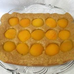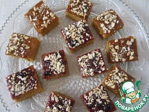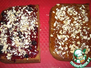 Разрезала корж на две половинки. Одну часть смазала смородиновым вареньем, другую-персиковым, посыпала орехами кешью.