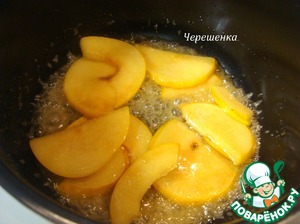 В чашу мультиварки положить сливочное масло и включить режим «Поджаривание» на 15 минут. Когда масло растопится, кладем в него кусочки айвы и посыпаем сахаром. Карамелизируем айву при постоянном помешивании до конца заданного режимом времени. Выключить функцию «Подогрев».