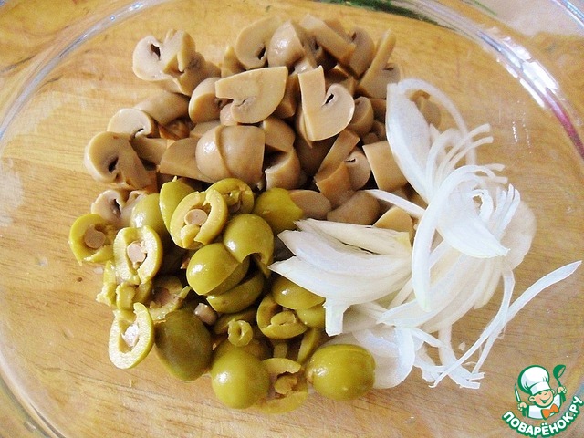 Пока варится фасоль - нарезаем лук тонкими полукольцами, маринованные грибы (если они очень крупные) и оливки.