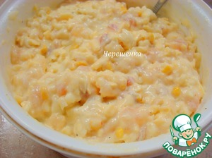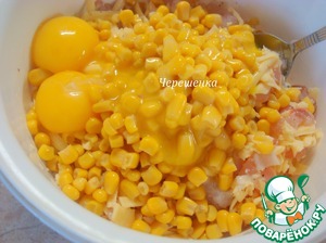 Отделить желтки от белков. Желтки перемешать с рыбой и сыром, добавить кукурузу.