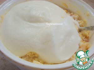 Отдельно взбить белки. Теперь к рыбной массе добавить набухшие рисовые хлопья и взбитые белки.