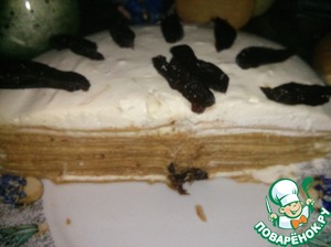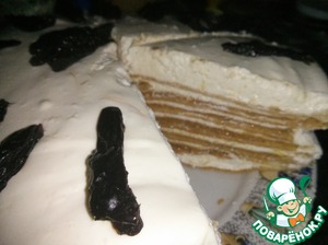 Когда вафли готовы, добавляю в творожную пасту желатин, формирую тортик, пока начинка не застыла. Вафля, творожный крем, вафля сгущенка ( которую взбила вилкой с маслом), далее повтор до нужной высоты. У меня 15 выживших вафель (вкусные "заразы", расхватали без начинки). На последний коржик-вафлю выложила толстый слой творожного крема и обмазала края. Теперь в холодное место.