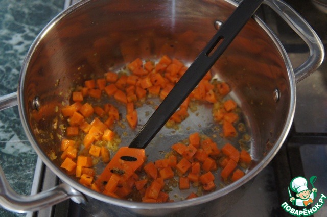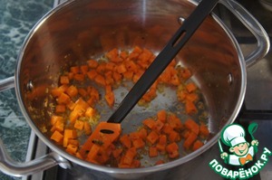 В кастрюле обжарить на растительном (или сливочном, если не поститесь) масле лук и морковь - 5 минут.