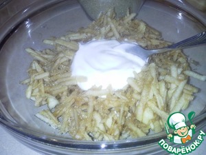Яблоки очищаем и натираем на крупной терке. Посыпаем сахаром, добавляем сметану, перемешиваем. Яблочки потемнели - ничего страшного!