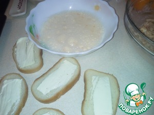 Каждый ломтик хлеба с одной стороны смазываем сливочным маслом. Молоко размешиваем с яйцом. Обмакиваем каждый кусочек хлеба в молоке и кладем масляной стороной на протвень, застеленный пекарской бумагой.