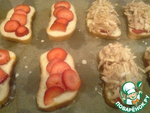 Клубнички режем на тонкие кружочки и кладем на каждый кумочек хлеба, сверху выкладываем яблоки. Поливаем по немногу оставшимся молоком и ставим в разогретую до 150 градусов духовку на 10-13 минут.