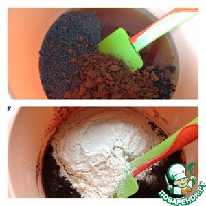 Добавить масло, мак и какао, перемешать. Далее разрыхлитель и мука, аккуратно перемешиваем, чтобы не было комочков