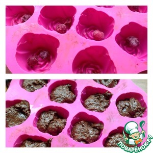 В формочки выкладываем вишню ( предварительно не надо размораживать), сверху тесто на треть формочки. Ставим в духовку на 20-30 мин при 180 гр