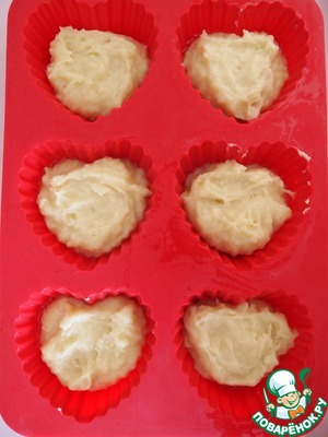 Далее разложить тесто по столовой ложке в силиконовые формочки. Отправить в духовку, заранее разогретую до 190 градусов, на 25 минут, затем снизить температуру до 170 градусов и выпекать 20 минут, далее снизить температуру до 150 градусов и выпекать еще 20 минут. Выключить духовку и оставить форму с пирожными до полного остывания духовки (при выпекании духовку не открывать!!!).