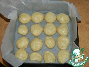 Затем поделим тесто на 16 маленьких булочек и выложим в форму. (у меня 24*24). Поставим в тепло, чтобы подошли.