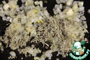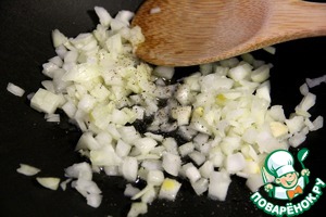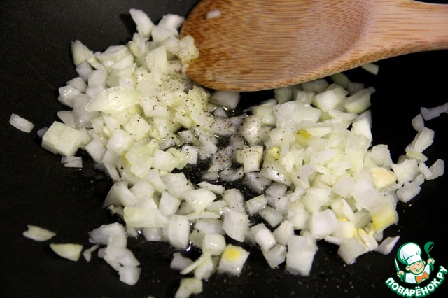 В глубокую сковороду (вок) наливаем масло и кладем мелко нарезанный лук, соль и перец и готовим 4 минуты.