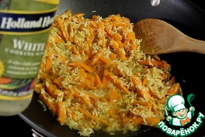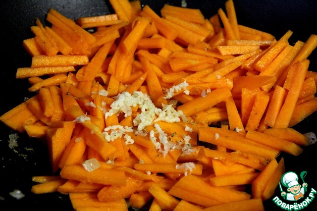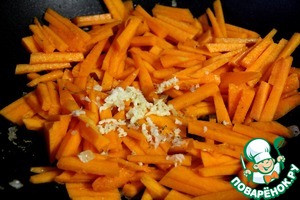 Затем добавляем порезанную соломкой тывку и мелко нарезанный чеснок и готовим около 3 минут.
