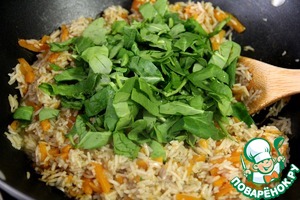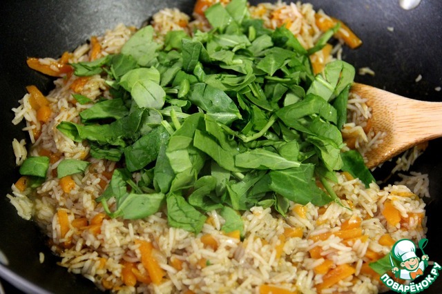 Шпинат мелко порезать и добавить в ризотто когда оно почти уже готово.
