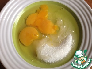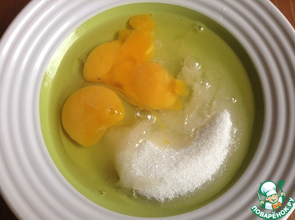 Тем временем яйца смешиваем с сахаром, просто размешиваем венчиком до однородного состояния,