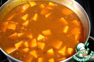 • Тыкву нарезаем на мелкие кубики и добавляем к фасоли вместе с мускатным орехом, гвоздикой и корицей и доводим до кипения.