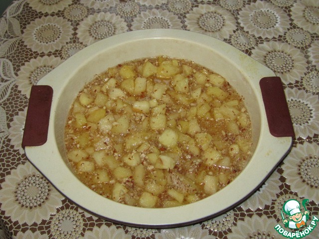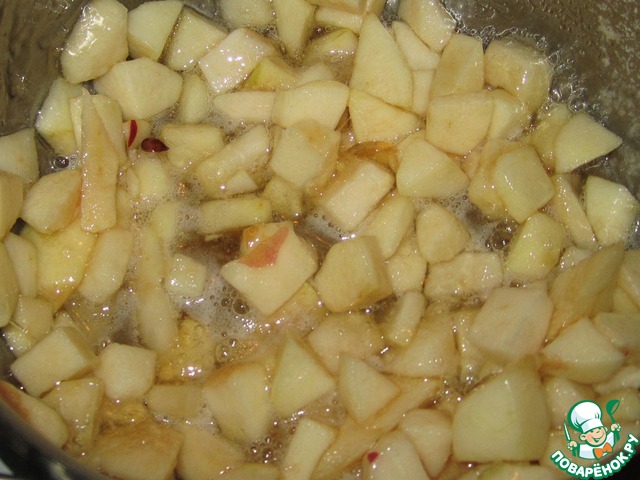 Как только смесь станет коричневой, добавить яблоки. После чего добавить масло и варить ещё несколько минут, помешивая.