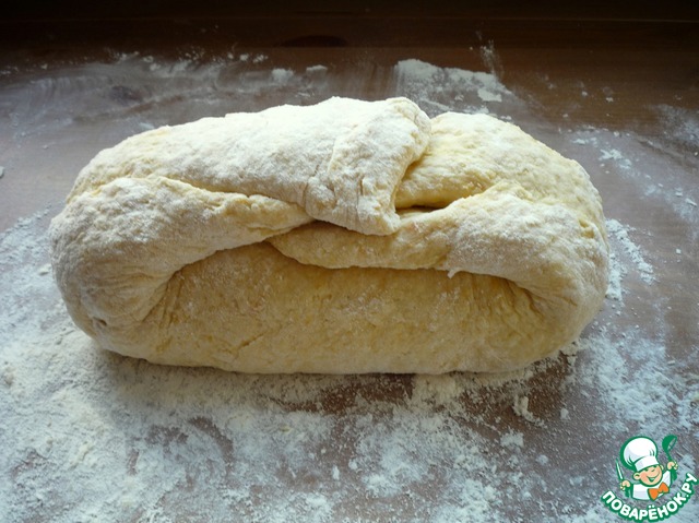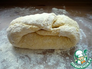 Подошедшее тесто (оно не сильно поднимется) выкладываем на стол и раскатываем. Далее сворачиваем рулончиком, подворачиваем края и снова раскатываем. Снова в рулон и оставляем так на 30-40 минут постоять, накрвыв полотенцем или убрав в полиэтиленовый пакет (можно опять унести в теплое место).