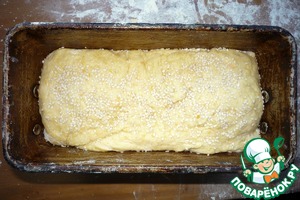 Через указанное время повторяем раскатку и снова сворачивание в рулон. Форму смазываем маслом и слегка посыпаем стенки солью (только не перестарайтесь). Перекладываем тесто в форму, посыпаем чем-нибудь сверху (я посыпала кунжутом) и снова отправляем в теплое место на 50 минут - 1 час.