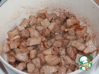 В кастрюле либо в казане с толстым дном на растительном масле до золотистой корочки обжариваем мясо.
