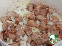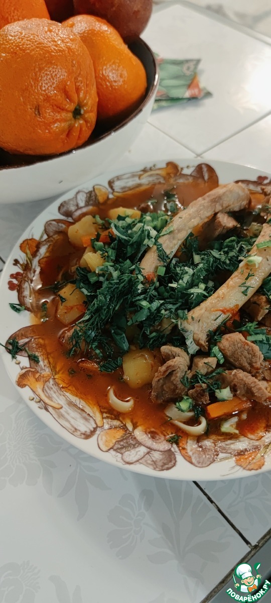 - Мясо (Я использовала нежирную свинину. Традиционно используют баранину или говядину) — 1 кг