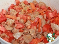 Добавляем нарезанный произвольно помидор и тушим все вместе примерно 15 минут.