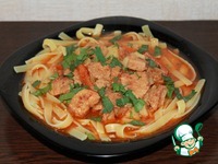 В тарелку кладем лапшу для лагмана. Поливаем подливкой, кто сколько любит. Сверху посыпаем любимой зеленью.