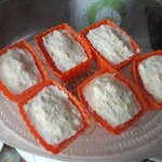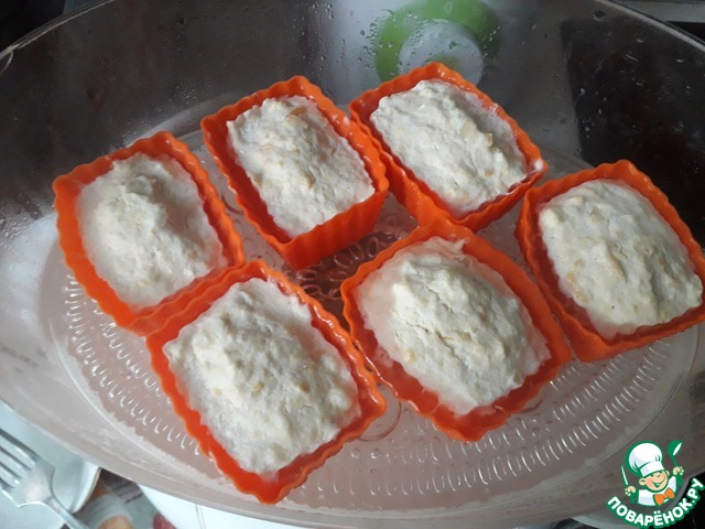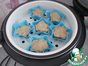 Выложить в силиконовые формочки. В чашу мультиварки залить 1 литр воды. Поставить контейнер. Программа "Варка на пару" 30 мин