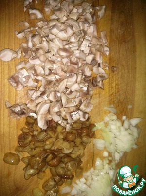 Начнём с приготовления грибной начинки. Измельчить грибы, лук.