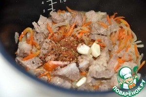Добавляем чеснок, приправу для плова, смесь перцев свежемолотую, соль.