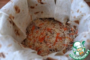 Плов накрываем краями лаваша, которые свисают. Сверху кладём кусочки сливочного масла.