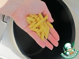 Перья отварить до полуготовности, примерно 5 минут. Слейть воду, макароны откинуть на дуршлаг.