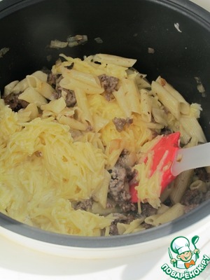Яичной смесью залить фарш с макаронами, хорошо перемешать.