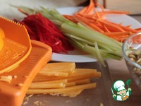 Порезать овощи на тонкие полоски, можно потереть на крупной тёрке.