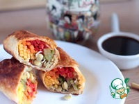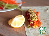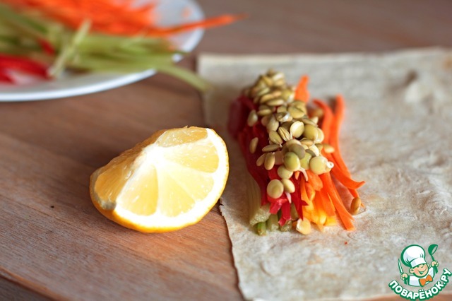 Красиво, слоями выложить овощи и проростки чечевицы на лаваш или рисовую бумагу, сбрызнуть лимонным соком и завернуть.