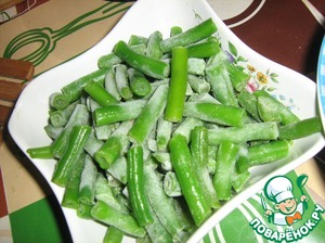 Взять глубокую жаровню- хорошенько разогреть 2 ст. л. масла и выложить на пассировку лук. Немного обжарив, в нее отправить перец, кабачок, стручковую фасоль. Обжарить, при постоянном помешивании.
