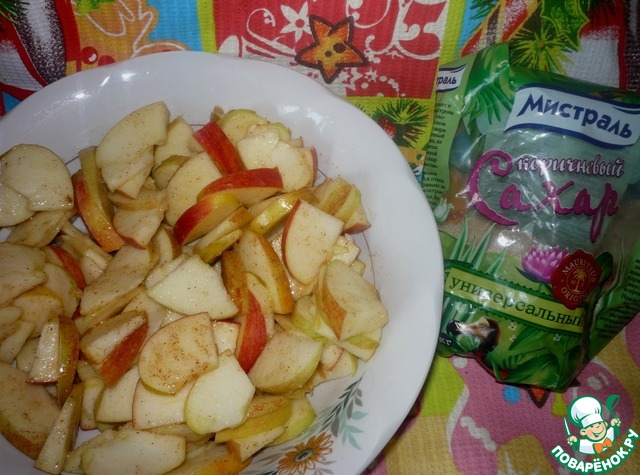 Яблоки порезать не крупными дольками, добавить сахар 2 ст. л. (лучше коричневый, он придаст карамельный вкус), лимонный сок, корицу, крахмал, щепотку соли. Перемешать и выложить в смазанную маслом форму.