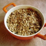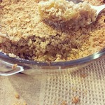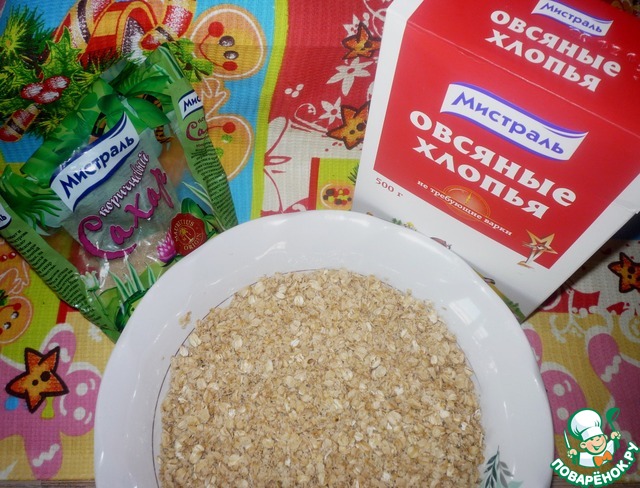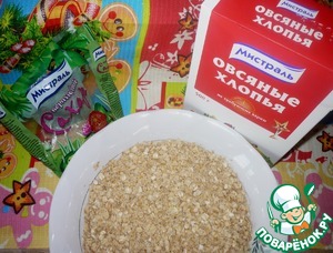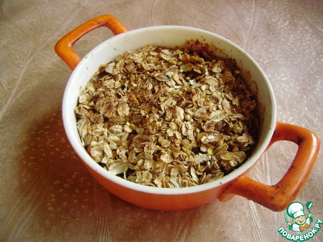 Смешать масло, сахар 2 ст. л. (можно заменить на мед), овсяные хлопья, муку, щепотку соли. Получается не тесто, а такая крупка.