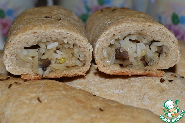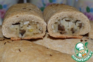 • Пока тесто подходит делаем начинку. Рис отвариваем, грибы жарим с луком. Начинку остужаем, солим перчим по вкусу.
