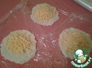 Выкладываем пару столовых ложек рисового теста на пищевую пленку, капнув на нее предварительно немного растительного масла. Формируем лепешку, выкладываем сыр
